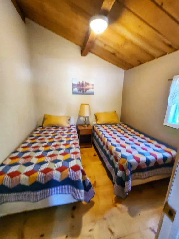 Champlain Cabin is an open concept 2 bedroom cottage. It has a small kitchen that is full equipped, with a cute breakfast dining area, 3 piece bath and a comfy queen pull out. Walk out onto the deck to spectacular views of the Mattawa River, equipped with BBQ & picnic table. Beside the cabin you will find a large shared bonfire space and infra-red sauna for two. Rustic by design.