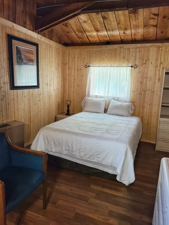 This lovely accessible cabin sits at the highest point on the grounds offering the best view of the river and mountains. Cabin offers a newly renovated large bathroom with large shower. Equipped with a full fridge, coffee make and BBQ on the deck.
